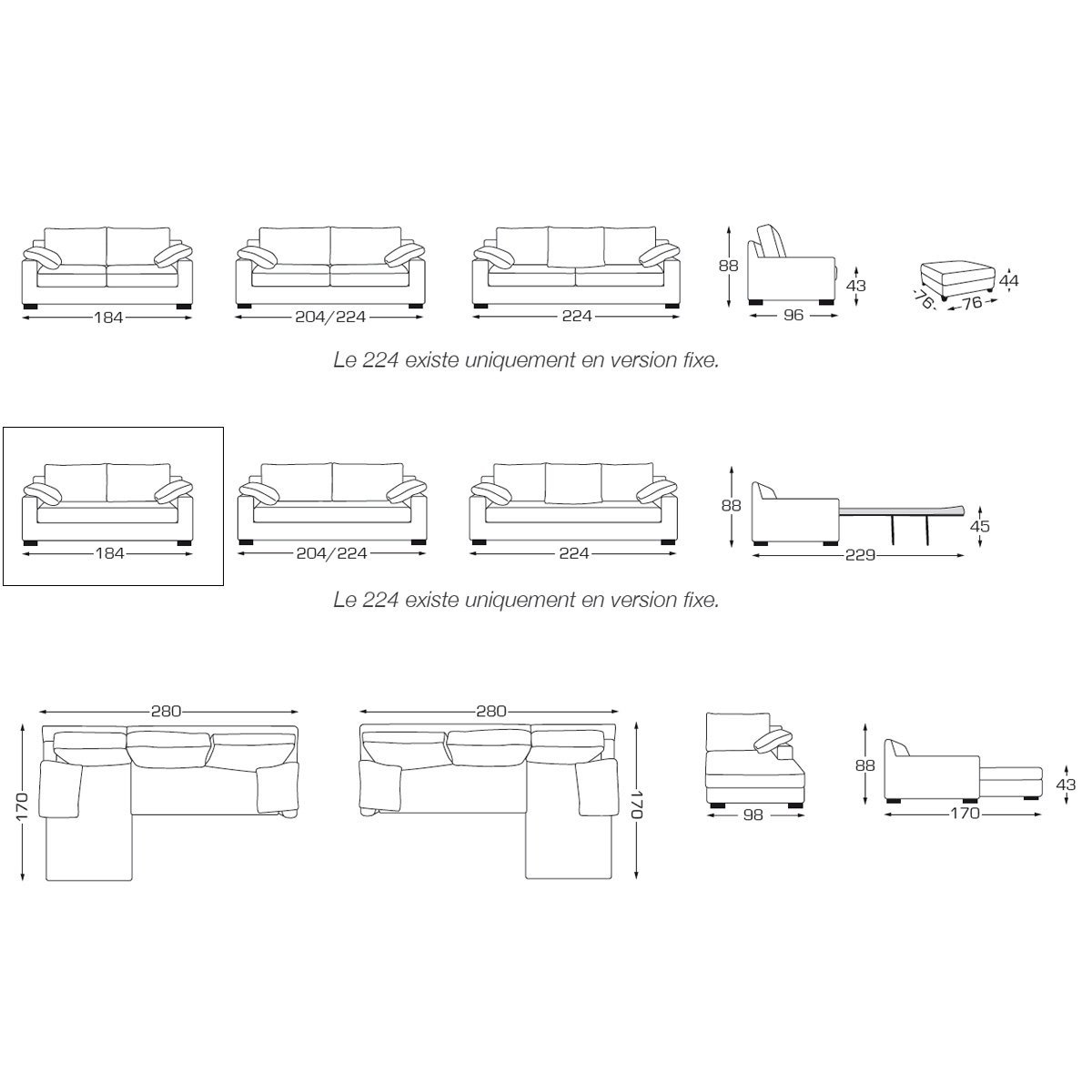 DimensionsLongueur : 184 cm - Hauteur : 88 cm - Profondeur : 96 cm - Hauteur de l'assise : 43 cm