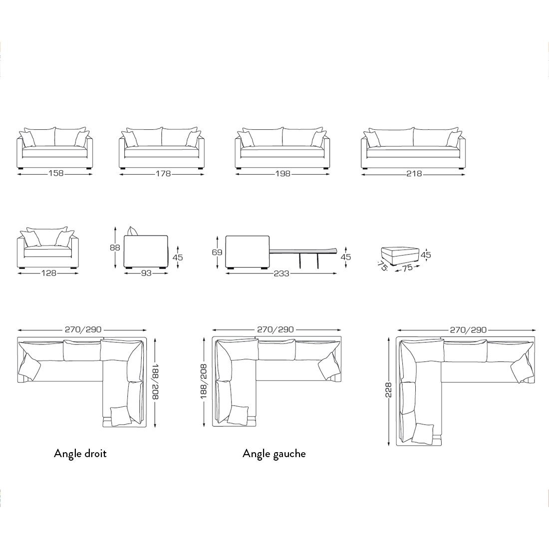 DimensionsLargeur : 270 cm - Hauteur : 88 cm - Profondeur : 93 cm / 188 cm - Hauteur d'assise : 45 cm