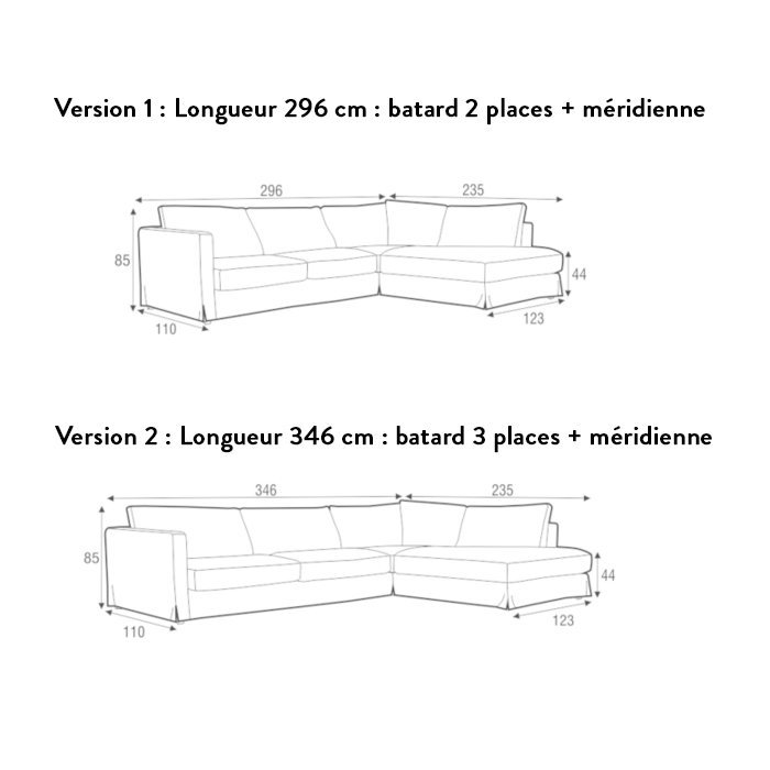 Le canapé d'angle Grenoble est proposé en vente en ligne dans 2 versions. La version 1 comprend un batard 2 places et une méridienne (longueur totale : 296 cm). La version 2 comprend un batard 3 places et une méridienne (longueur totale : 346 cm).