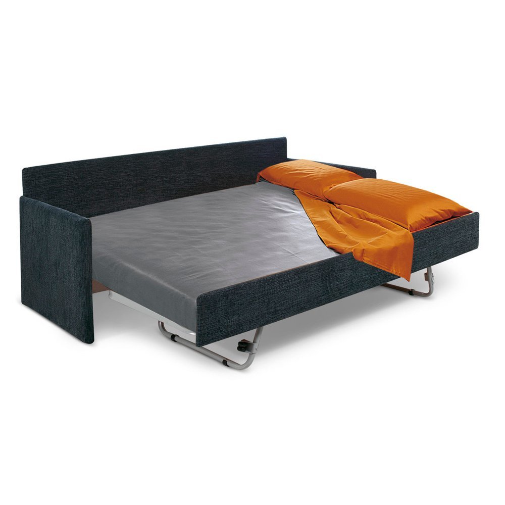 Ce canapé lit gigogne dispose d'un dossier et de manchettes fixés à la structure par un système de glissières pour faciliter le démontage.