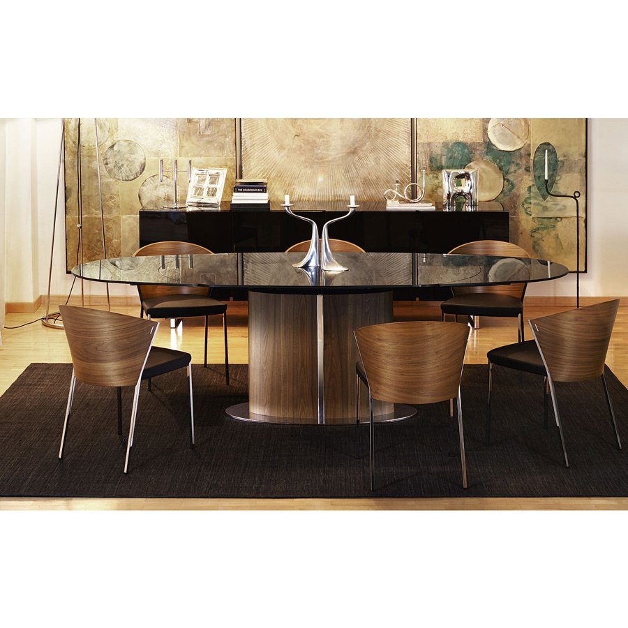 La particularité de cette chaise réside dans le dossier en placage bois incurvé, délimité sur les côtés par la structure en acier qui forme un ensemble avec les pieds.