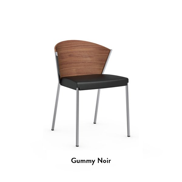 Le confort unique de cette chaise contemporaine, est souligné par son assise large rembourrée et revêtue de Gummy, un tissu synthétique, souple et doux au toucher et très pratique car facile à nettoyer, disponible en noir et blanc.
