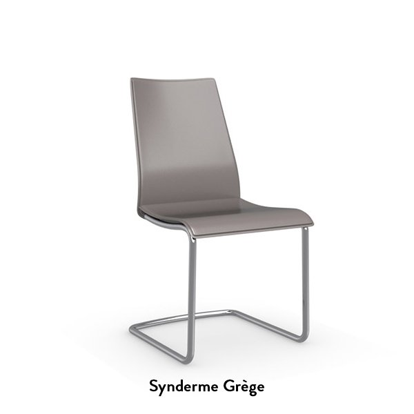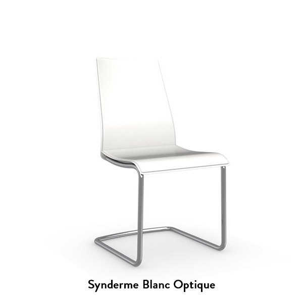Son assise et son dossier sont revêtus de synderme,une matière composée de cuir et d’autres fibres naturelles et finie comme le cuir, disponible en blanc optique, noir et grège.