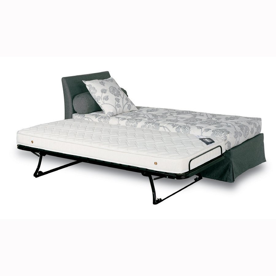 Ce canapé lit gigogne est équipé d'un coussin polochon garni en fibres polyester et d'un coussin déco garni en fibres polyester.