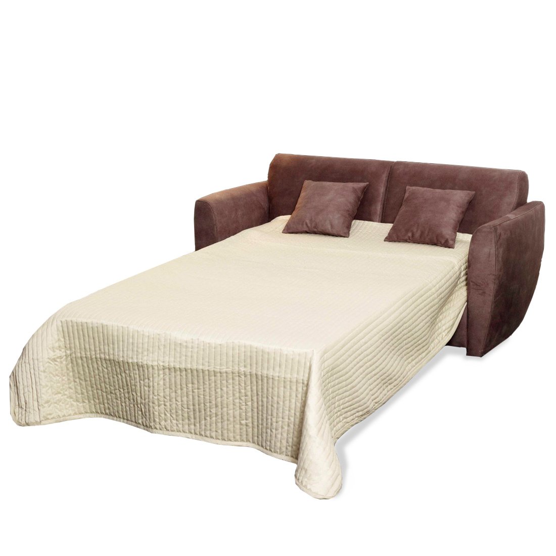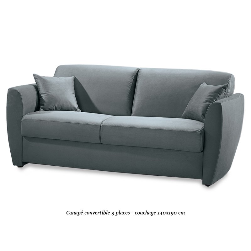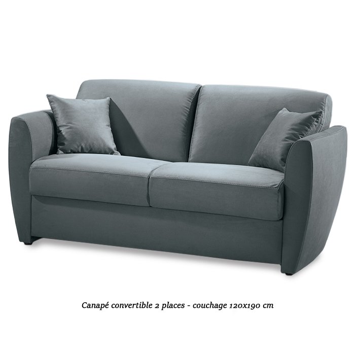 Ce canapé lit est équipé d'un couchage occasionnel de 120x190 cm (canapé 2 places) ou de 140x190 cm (canapé 3 places), composé d'une mécanique 3 plis, d'une toile tenue par des ressorts et d'un matelas Simmons Monoflex de 7 cm d'épaisseur, 115 cm ou 135 cm de largeur et 186 cm de profondeur, en mousse polyuréthane HR 30 kg/m³ avec un plateau piqué.