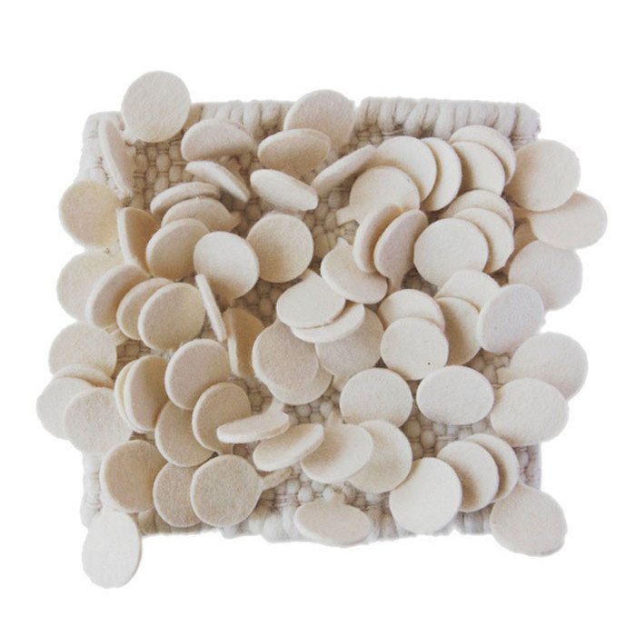 Les pièces de feutre de forme égale qui caractérise ce tapis lui donnent un volume et un mouvement constant, l'invitant à être touché, caressé, vécu.